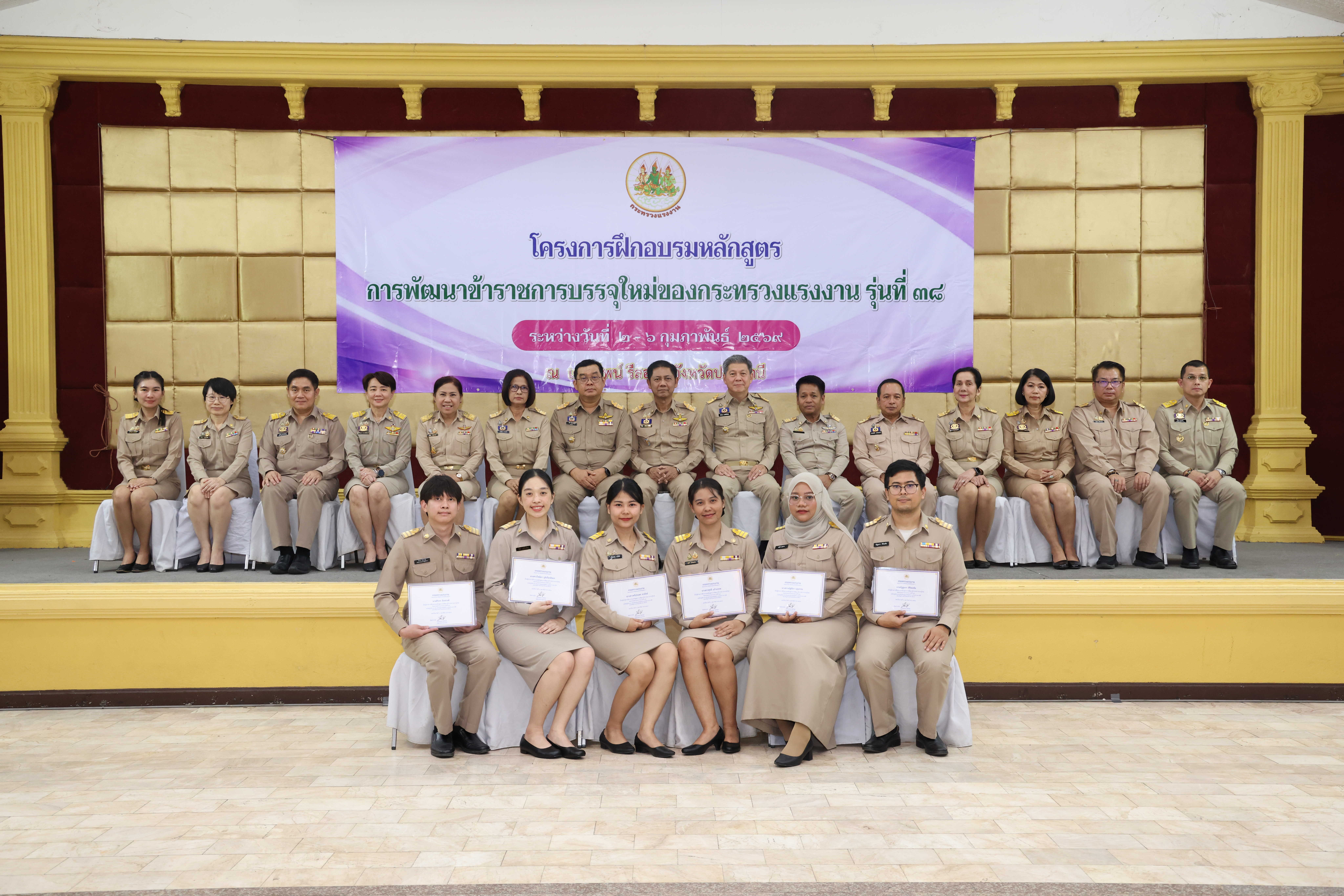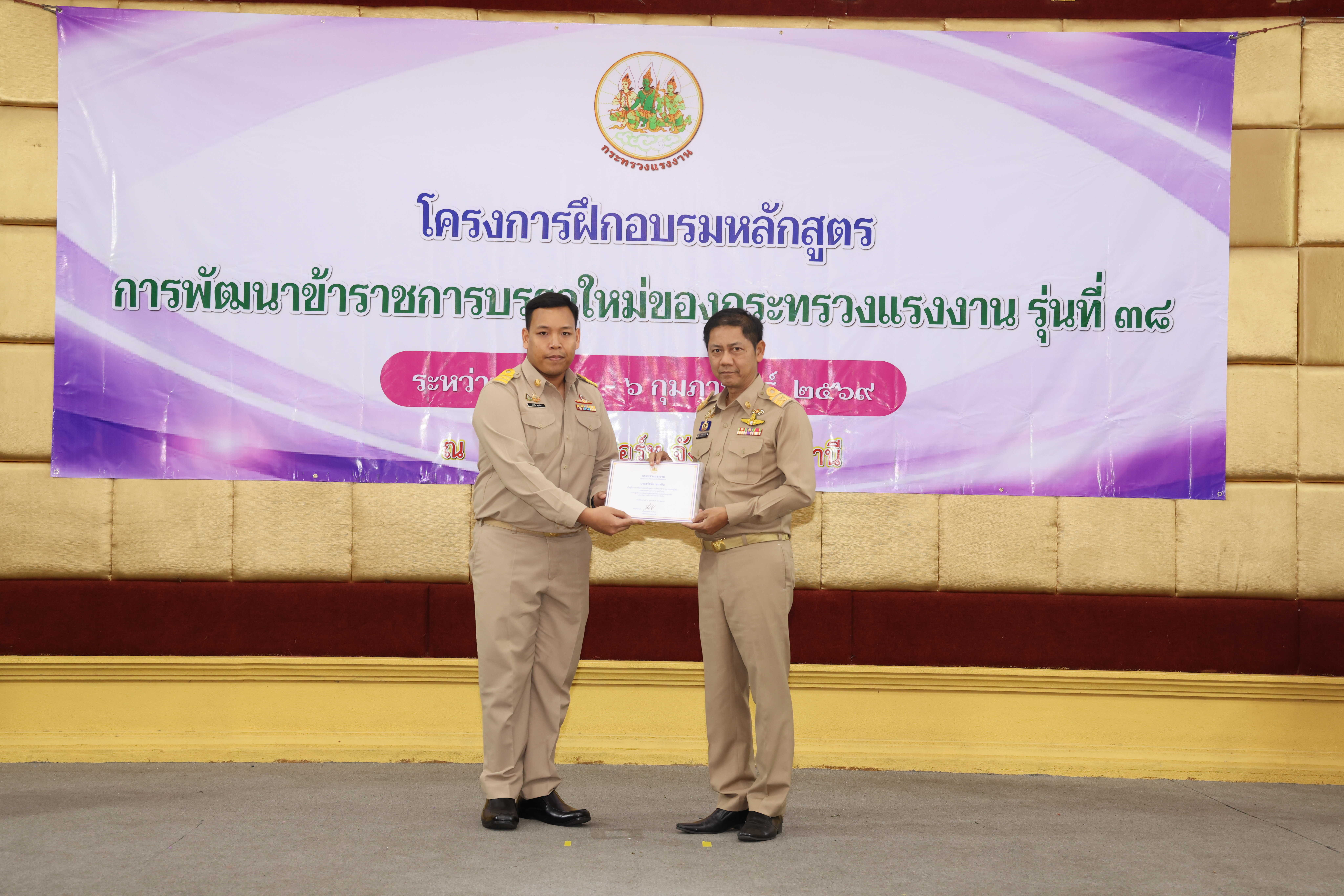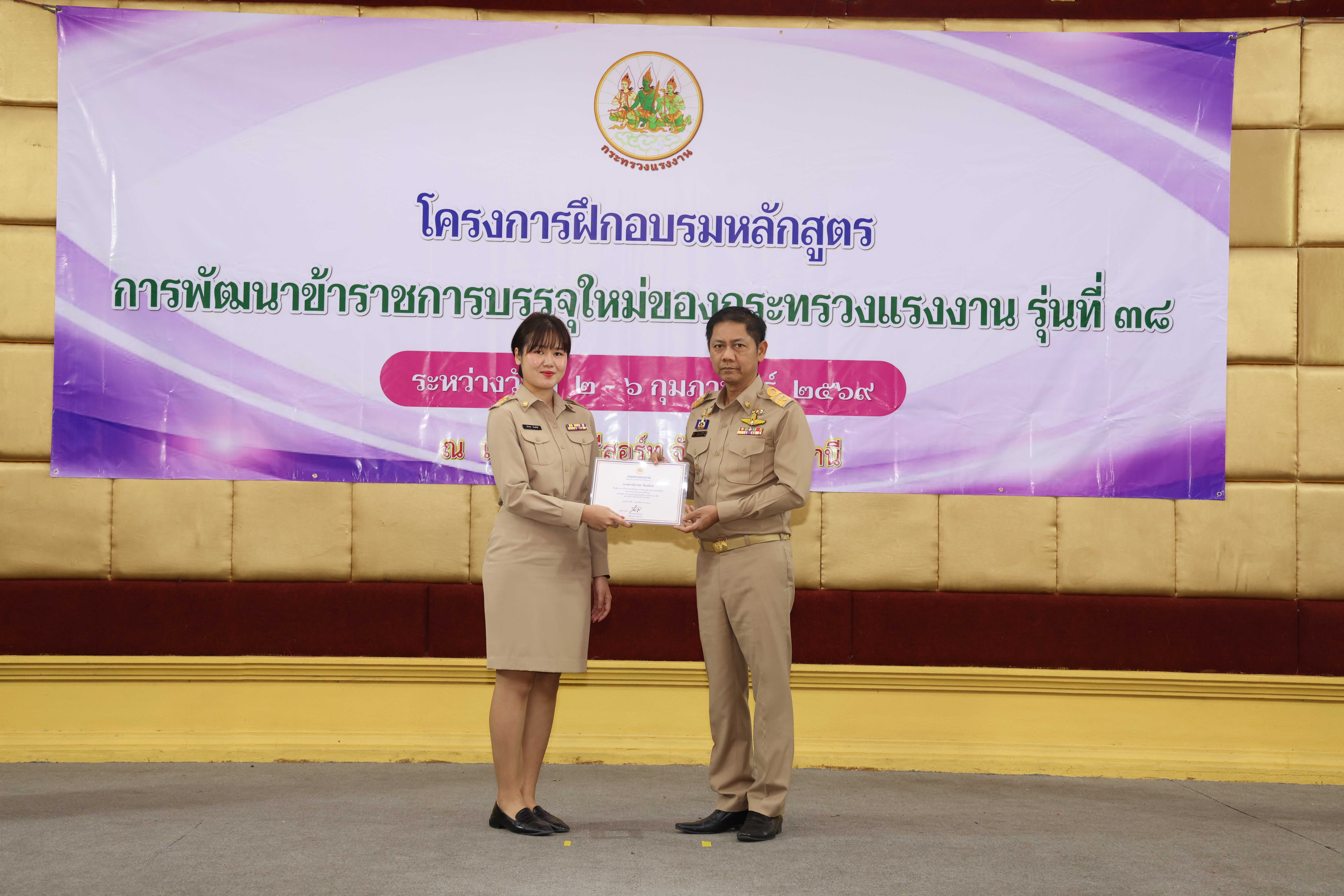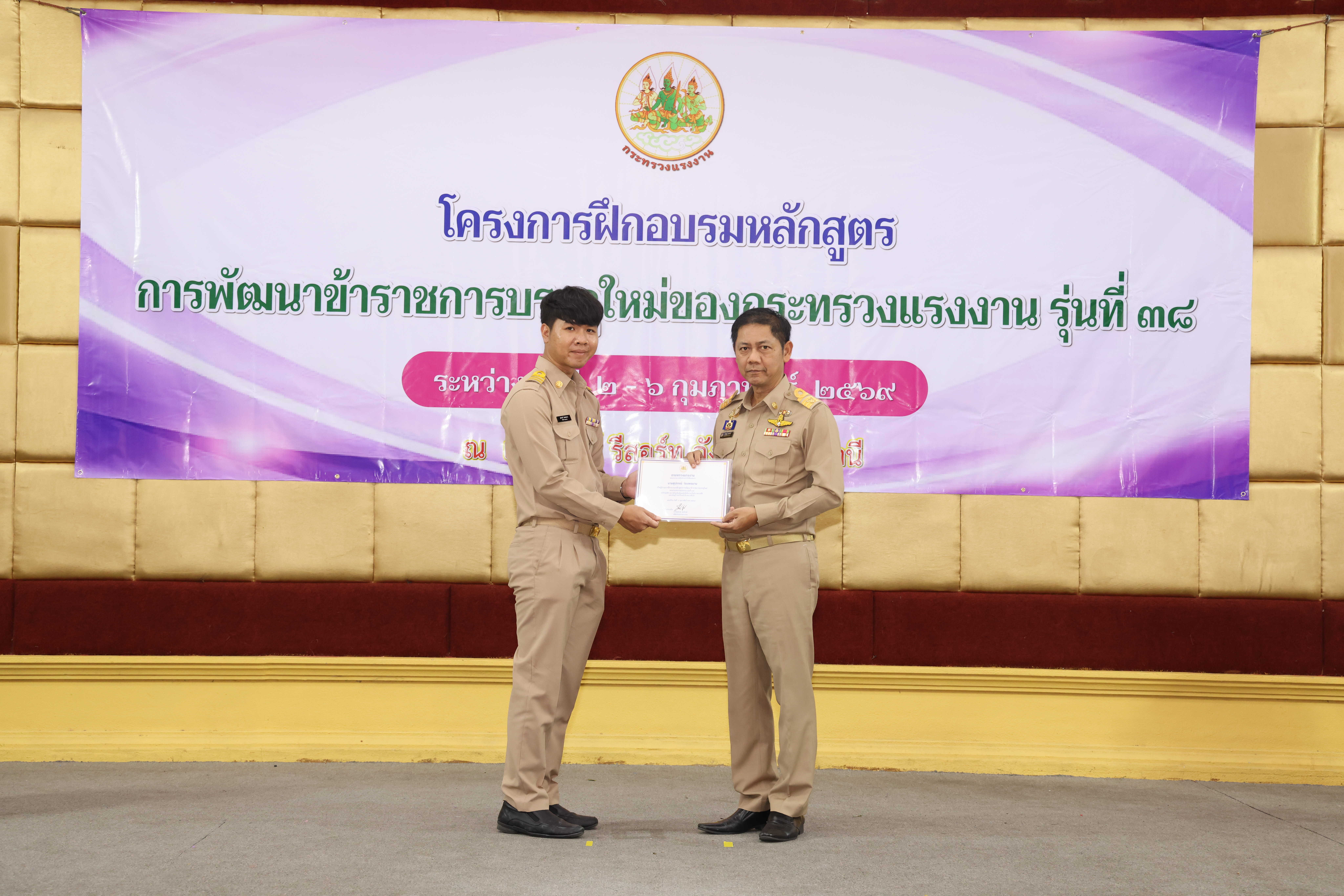 วันที่ 6 กุมภาพันธ์ 2569 เวลา 14.00 น. พันตำรวจโท วรรณพงษ์ คชรักษ์ ปลัดกระทรวงแรงงาน มอบหมายให้ นายพิเชษฐ์ ทองพันธ์ รองปลัดกระทรวงแรงงาน เป็นประธานพิธีปิดโครงการฝึกอบรมหลักสูตรการพัฒนาข้าราชการบรรจุใหม่ของกระทรวงแรงงาน รุ่นที่ 38 พร้อมมอบประกาศนียบัตรให้แก่ผู้ผ่านการฝึกอบรม โดยมี นายศักดินาถ สนธิศักดิ์โยธิน ผู้ช่วยปลัดกระทรวงแรงงาน และผู้บริหารระดับสูงหน่วยงานในสังกัดกระทรวงแรงงาน เข้าร่วมด้วย ณ ห้องประชุม To be number one โรงแรมเดอะไพน์ รีสอร์ท อำเภอสามโคก จังหวัดปทุมธานี
