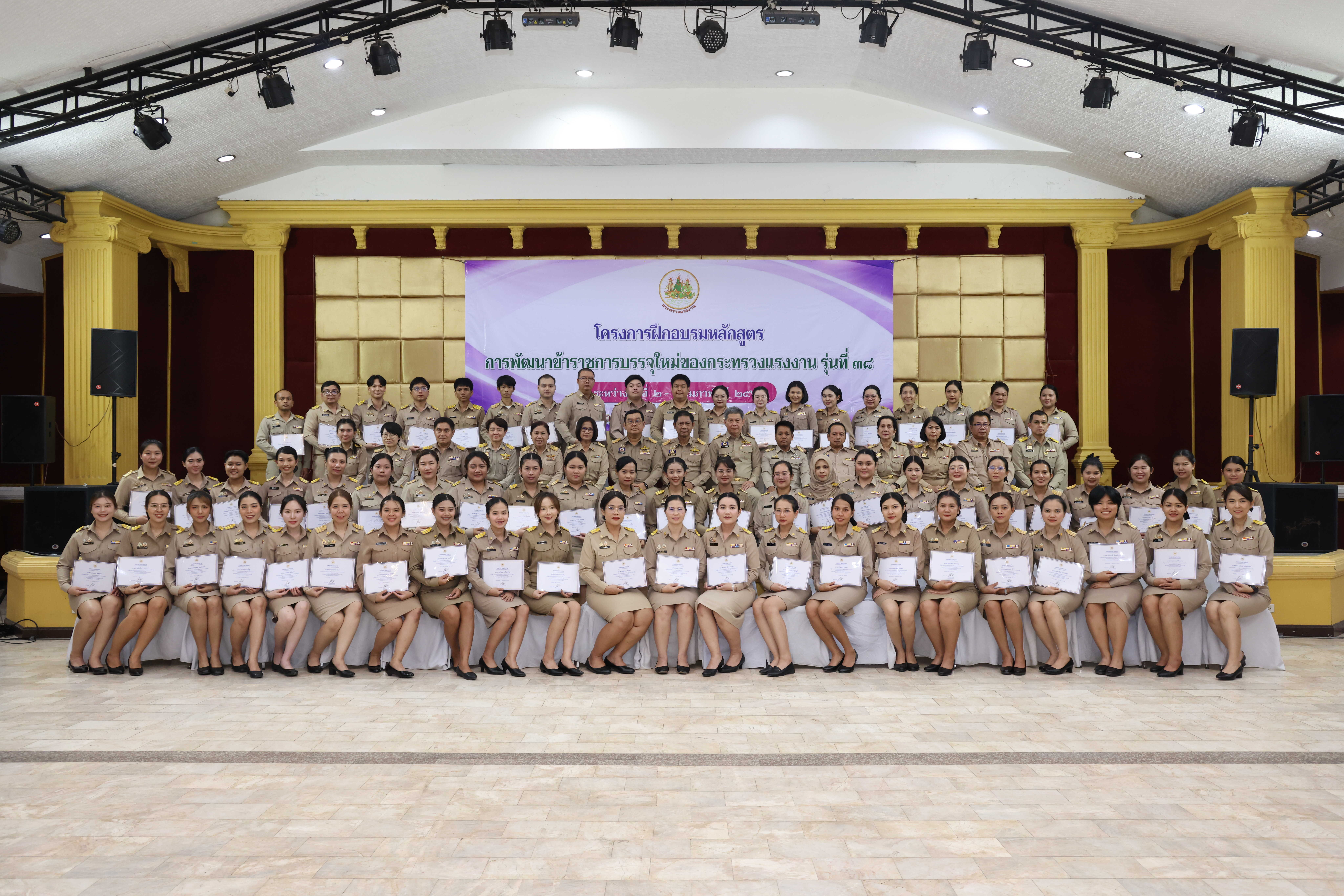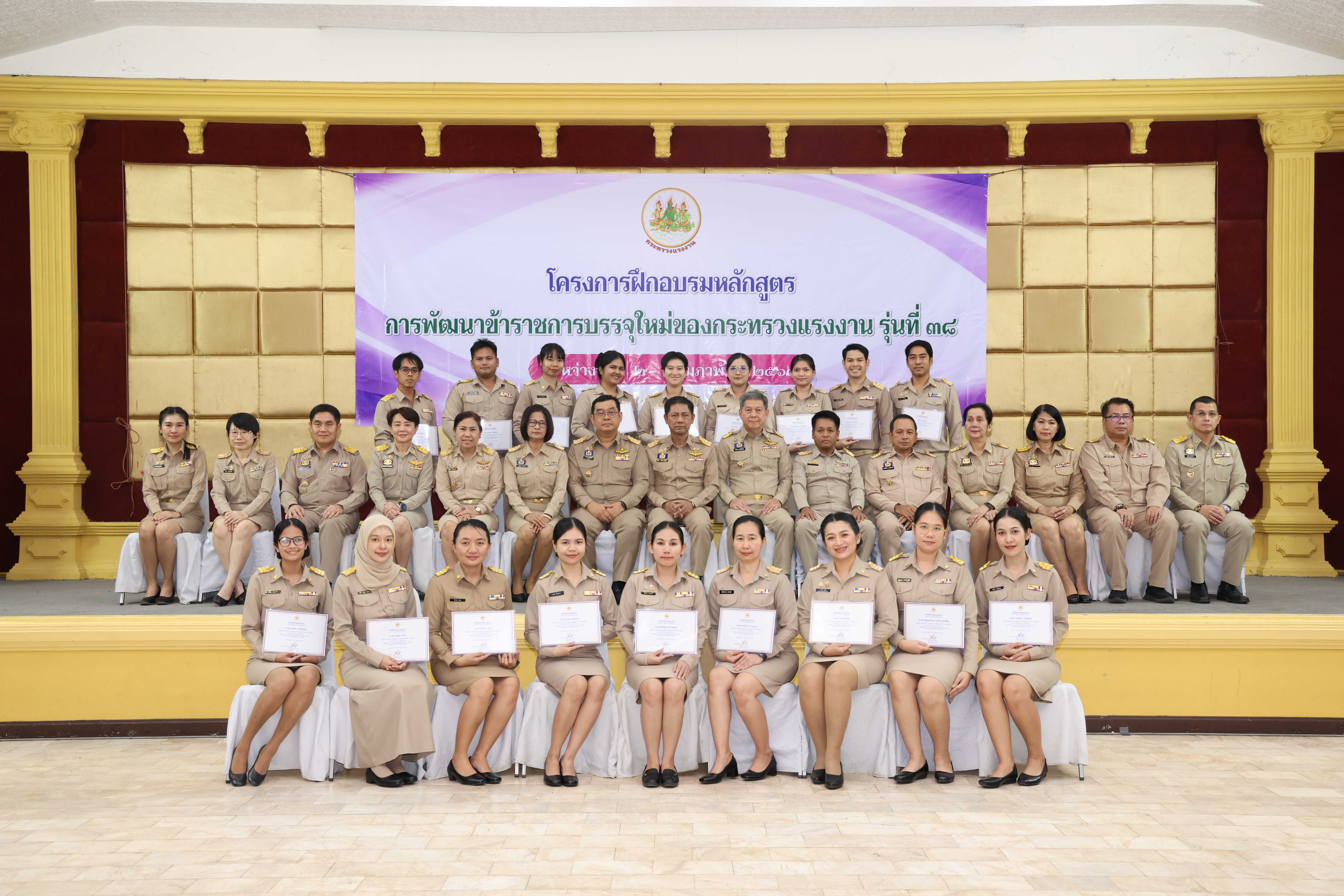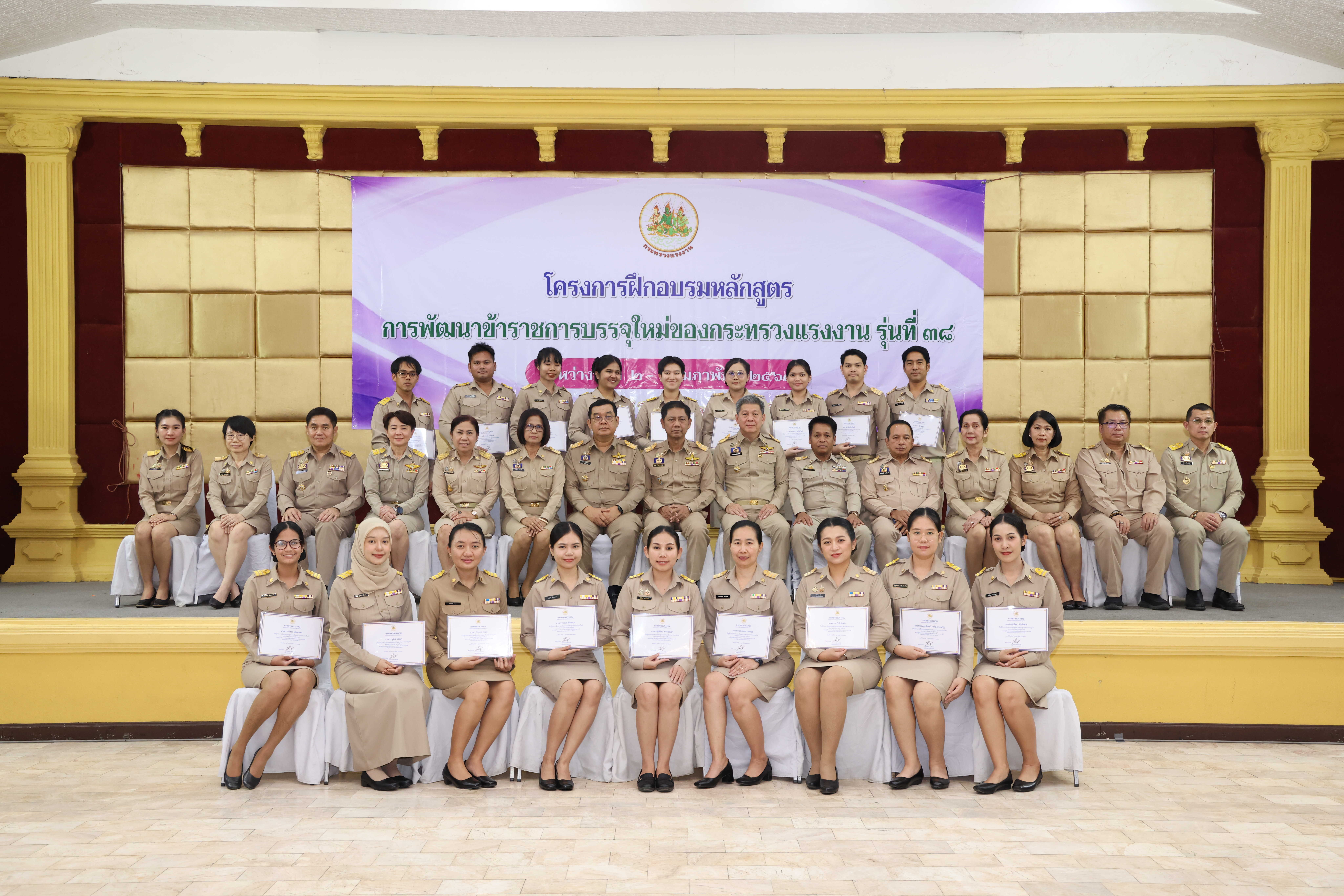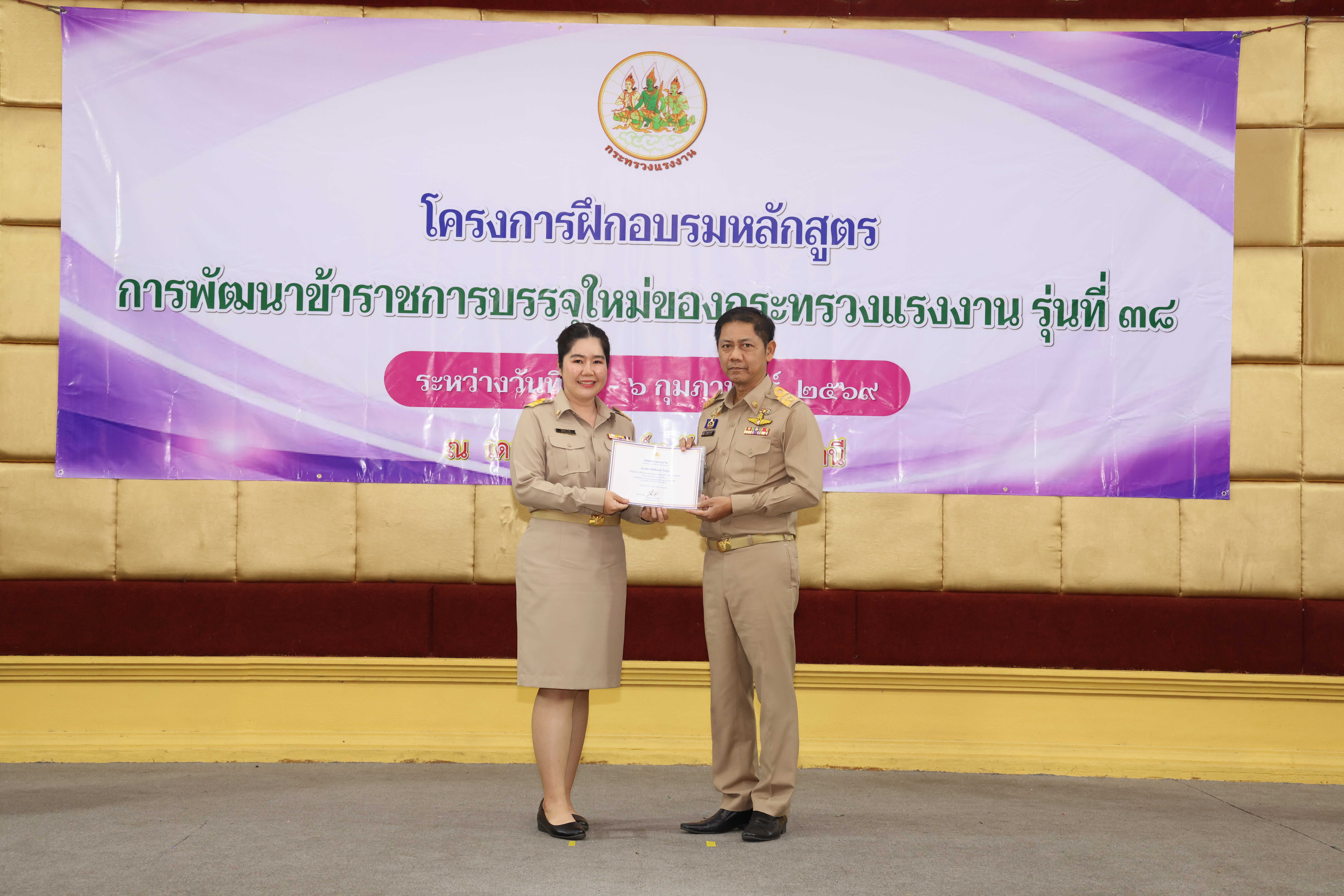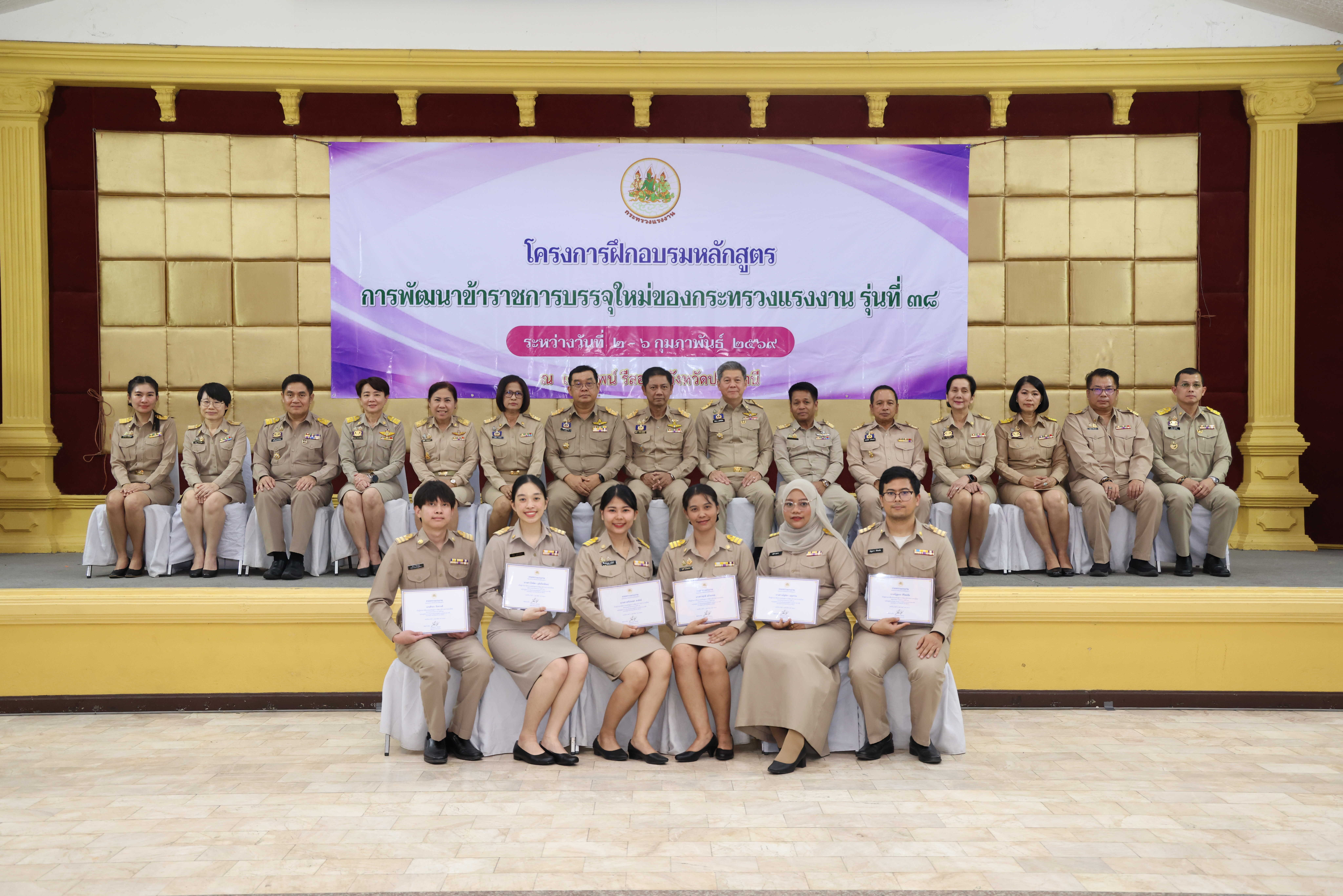 วันที่ 6 กุมภาพันธ์ 2569 เวลา 14.00 น. พันตำรวจโท วรรณพงษ์ คชรักษ์ ปลัดกระทรวงแรงงาน มอบหมายให้ นายพิเชษฐ์ ทองพันธ์ รองปลัดกระทรวงแรงงาน เป็นประธานพิธีปิดโครงการฝึกอบรมหลักสูตรการพัฒนาข้าราชการบรรจุใหม่ของกระทรวงแรงงาน รุ่นที่ 38 พร้อมมอบประกาศนียบัตรให้แก่ผู้ผ่านการฝึกอบรม โดยมี นายศักดินาถ สนธิศักดิ์โยธิน ผู้ช่วยปลัดกระทรวงแรงงาน และผู้บริหารระดับสูงหน่วยงานในสังกัดกระทรวงแรงงาน เข้าร่วมด้วย ณ ห้องประชุม To be number one โรงแรมเดอะไพน์ รีสอร์ท อำเภอสามโคก จังหวัดปทุมธานี