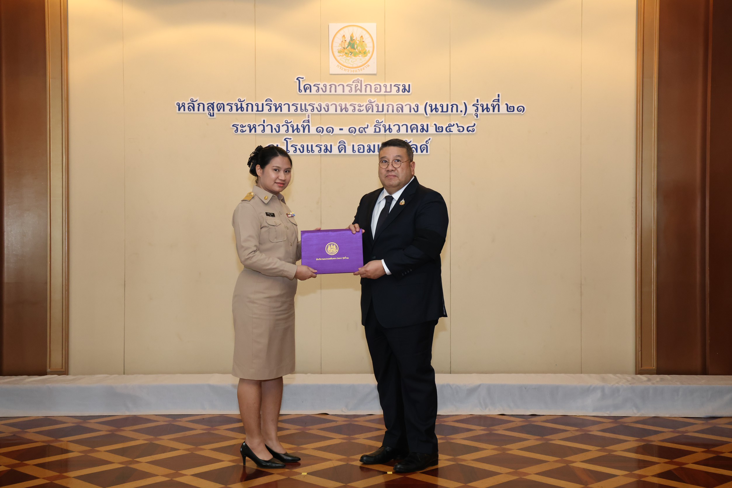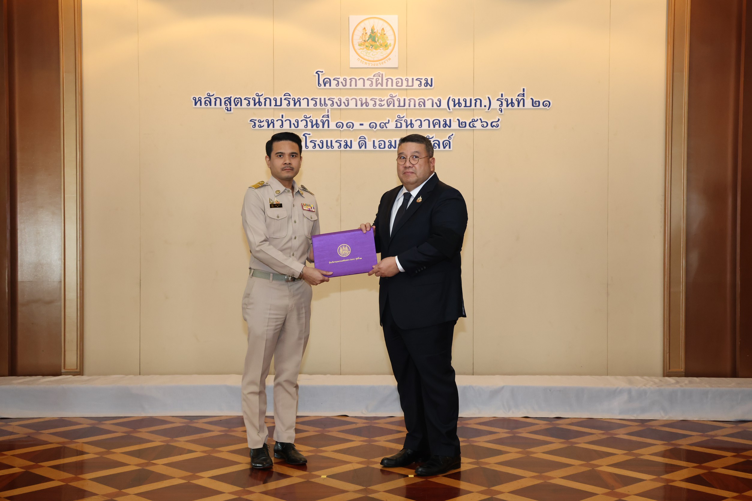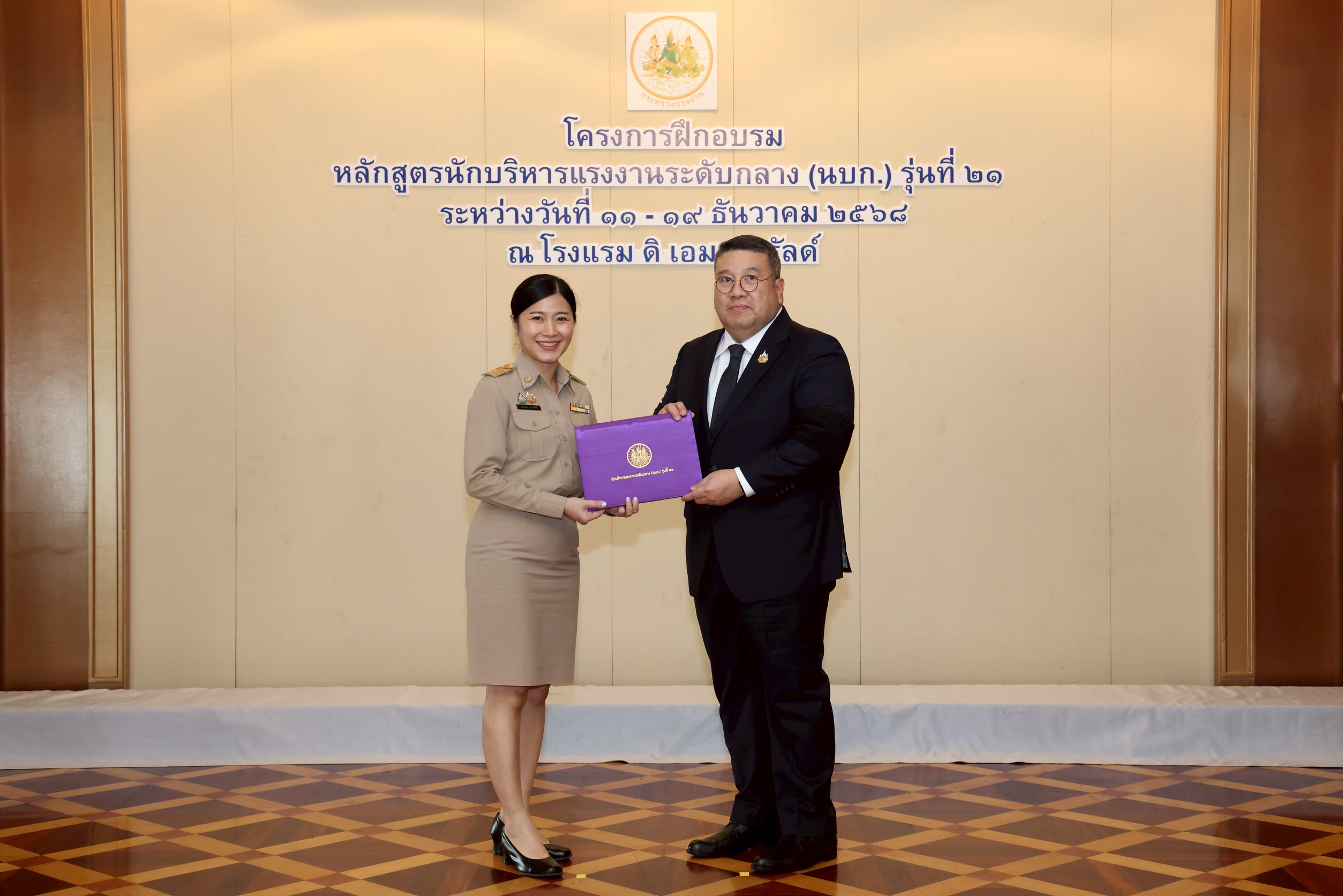 วันที่ 19 ธันวาคม 2568 เวลา 15.00 น. พันตำรวจโท วรรณพงษ์ คชรักษ์ ปลัดกระทรวงแรงงาน เป็นประธานมอบประกาศนียบัตรและปิดการฝึกอบรมหลักสูตรนักบริหารแรงงานระดับกลาง (นบก.) รุ่นที่ 21 โดยมี นายสิบหมื่นชัย โพธิสินธุ์ ผู้ตรวจราชการกระทรวงแรงงาน นายศักดินาถ สนธิศักดิ์โยธิน ผู้ช่วยปลัดกระทรวงแรงงาน และข้าราชการผู้ผ่านการฝึกอบรม เข้าร่วมด้วย ณ ห้องแกรนด์พาโนรามา ชั้น 14 โรงแรมดิ เอมเมอรัลด์ ถนนรัชดาภิเษก เขตดินแดง กรุงเทพมหานคร